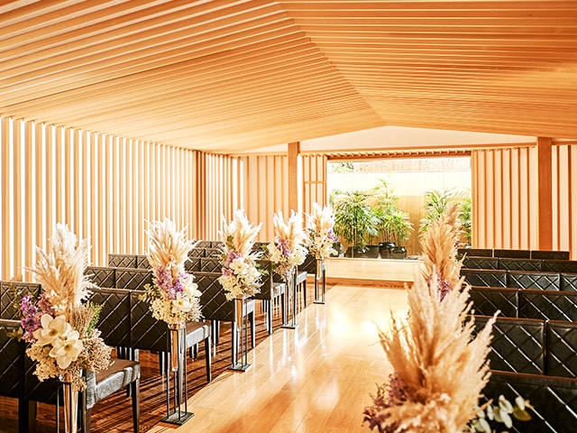 格式を感じさせながらも、柔らかな光と木の温もりに満ちた空間が、ふたりの誓いをあたたかく包み込みます。